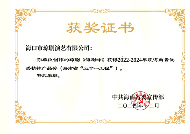 ?谑协倓⊙菟囉邢薰玖疂嵨幕黝}文藝作品原創(chuàng)瓊劇《海剛峰》和《丘濬》均獲得 2022-2024年度海南省優(yōu)秀精神產(chǎn)品獎(jiǎng)(海南省“五個(gè)一工程”)。2024年12月30日上午,中共海南省委宣傳部對(duì)2022-2024年度海南省優(yōu)秀精神產(chǎn)品獎(jiǎng)(海南省“五個(gè)一工程”)獲獎(jiǎng)作品進(jìn)行表彰。